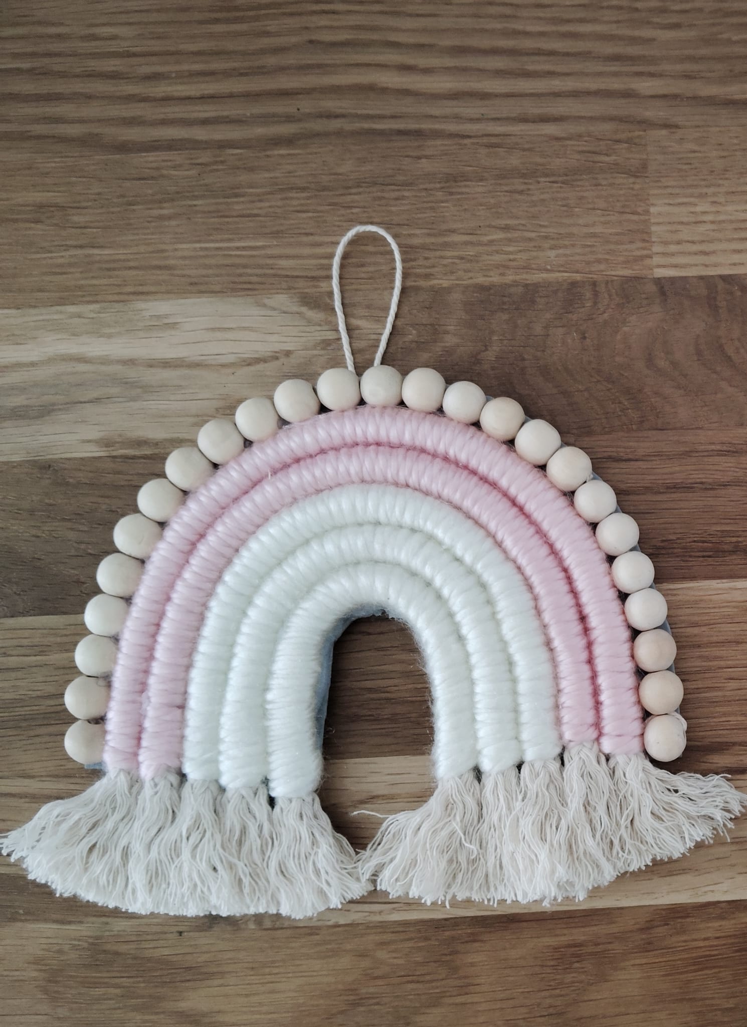 Suspension arc-en-ciel rose et blanc façon « macramé ».